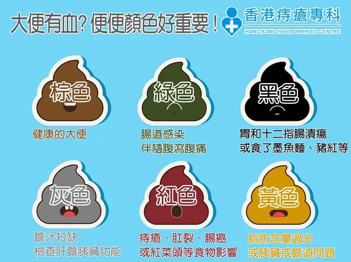 健康的大便應呈現褐色/棕色,這是膽紅素在消化過程中形成的顏色。 若大便有血, 或呈其他顏色,應盡快尋求醫護協助。